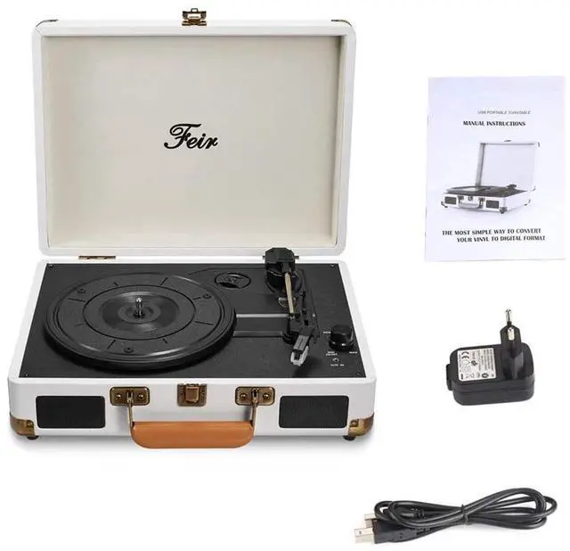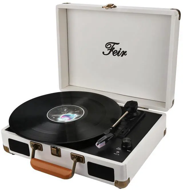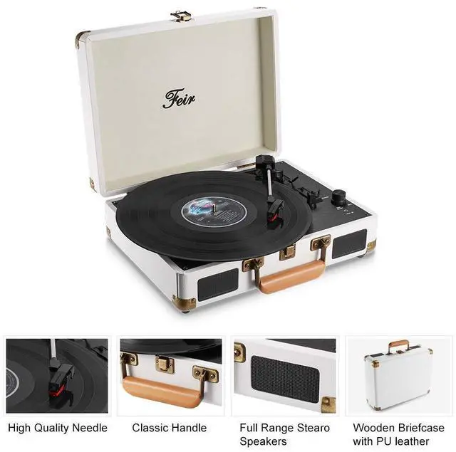For many music enthusiasts, nothing can ever compare to the sound quality of a vinyl record. The more things change, the more they stay the same.The new generation has begun purchsing a portable record player and spearheading a revival of the industry. Feir TP204 Turntable is the perfect combination of trendy and retro. It includes 3 speeds, soft damping control, integrated speakers, RCA/AUX-In, durable PU leather case and an integrated carrying handle. The Briefcase Turntable is portable and ready for wherever life takes you.