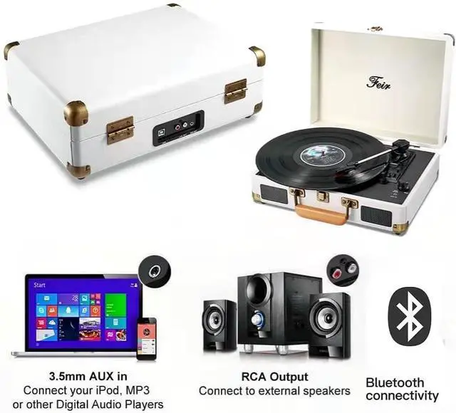including built-in Bluetooth technology for wireless music streaming from any Bluetooth-enabled device, 3-speed turntable (33 1/3, 45, 78 RPM), built-in speakers, for playback from 3.5mm aux input jack for music from any non-Bluetooth device Bluetooth device, RCA jack and headphone jack.With its gift shape design portable turntable, is the greatest present.