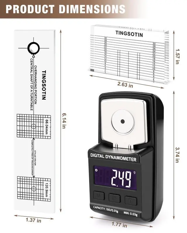 Get everything you need for precise turntable cartridge setup in one complete kit. Includes a digital stylus force scale, alignment protractor, VTA azimuth ruler, and protective case for safe storage.Improve tracking accuracy, stereo separation, and overall sound clarity. Fine-tune stylus alignment and tracking force to reduce skipping and distortion for cleaner vinyl playback.Compatible with S-shaped tonearms and all standard 1/2" mount cartridges. Designed for easy adjustments, durable use, and consistent, accurate results.