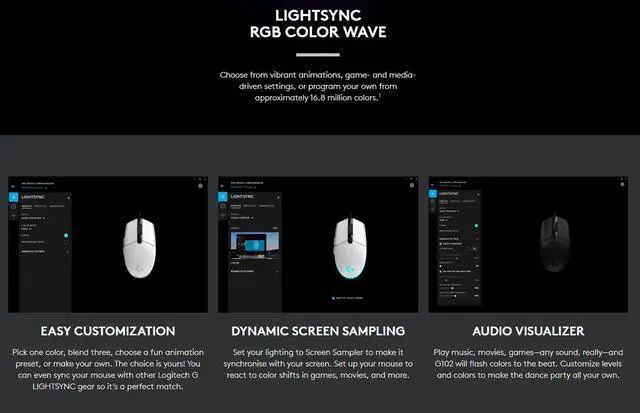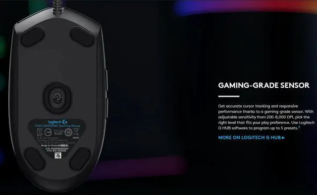 Logitech G102 PRODIGY Gaming Mouse reports 1,000 times per second, 8x faster than standard mice. This means when the mouse is moved or clicked the onscreen response is virtually instantaneous. Play to your full potential with a mouse that offers 200 to 8,000 DPI delivering incredible accuracy, tracking speed and consistency. LIGHTSYNC technology provides next-gen RGB lighting that synchronizes lighting and game profiles with your content. Customize from a full spectrum of approximately 16.8 million colors and synchronize lighting animations and effects with your other Logitech G devices. Customize it all quickly and easily using Logitech Gaming Software (LGS).On-the-fly DPI shifting between two sensitivity settings with a click, from pixel-precise 250 DPI targeting to speedy 2,500 DPI movement. Use LGS to customize the DPI settings to fit your style of play. Also, DPI cycling lets you choose from up to five DPI settings while in-game.System requirements are Windows® 7 or later, macOS® 10.11 or later, chrome OSTM, USB port and internet access for Logitech Gaming Software (optional).Responsiveness data formats are 16 bits/axis, USB report rate: 1000 Hz (1ms), microprocessor 32-bit ARM.