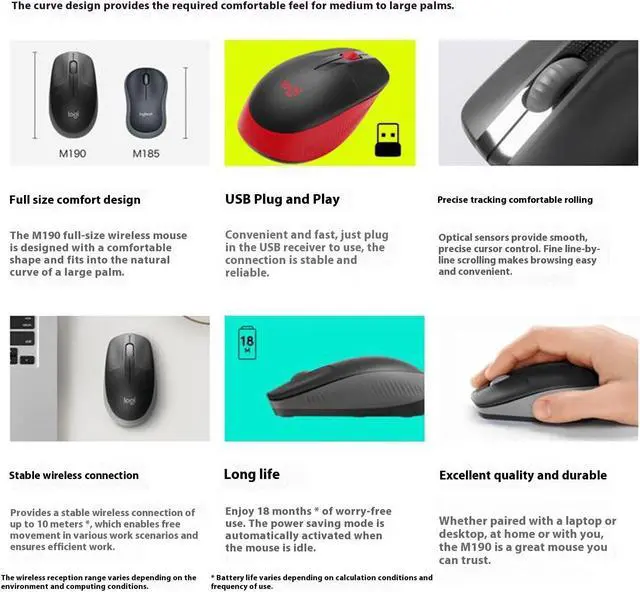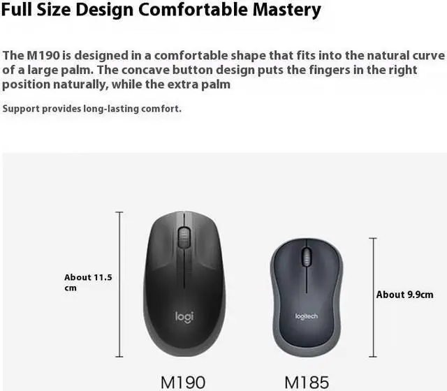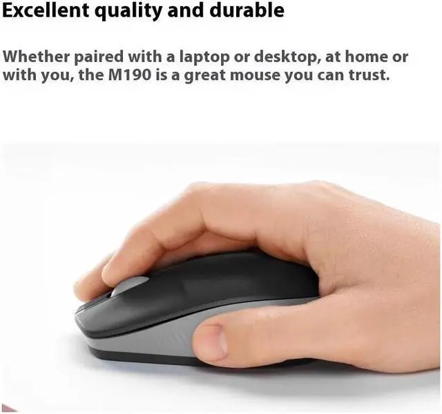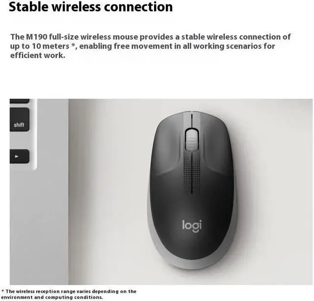 The Logitech M190 is a full-size wireless mouse with a comfortably shaped design that conforms to the natural curves of medium to large hands, allowing you to work wirelessly and move freely with little to no delay or packet loss.