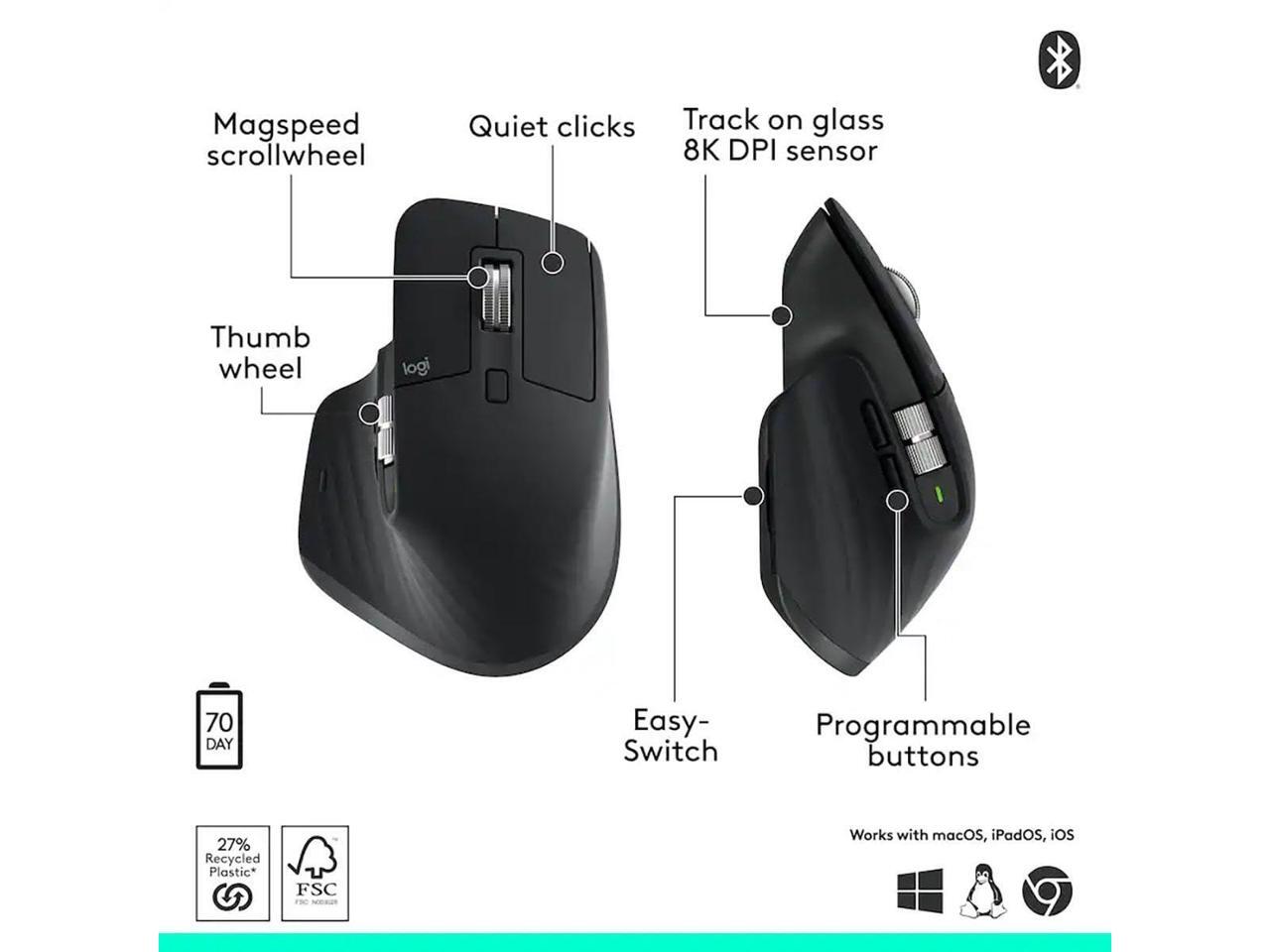 Logitech MX Master 3S Performance Wireless Mouse with Ultra-fast Scrolling Ergo 8K DPI Track on Glass Quiet Clicks Bluetooth Windows Linux Chrome Black 910007500