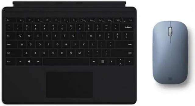 Microsoft Surface Mobile Mouse Ice Blue Your go-to everyday mouse Wireless Bluetooth connection Surface Mobile Mouse pairs easily with your Surface laptop via wireless Bluetooth connection - no cords or dongle required. Surface Mobile Mouse features a smooth, sculpted design with a wheel that fits comfortably in your hand and supports smooth, natural scrolling. Surface Mobile Mouse coordinates perfectly with Surface Go Signature Type Cover, Surface Pro Signature Type Cover, and Surface Pen. + Microsoft Surface Pro X Keyboard Black Alcantara For a full keyboard and comfortable typing experience anywhere, pair Surface Pro X Keyboar