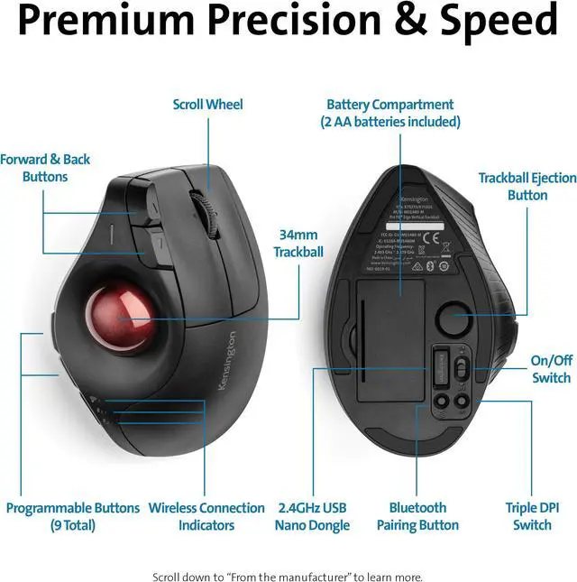 Give your hand a healthy break. Upgrade to ergonomist-approved comfort and premium cursor control with Kensingtons Pro Fit® Ergo Vertical Wireless Trackball. A 60° tilt angle keeps the wrist in a natural handshake position to improve wrist and forearm posture. This mouse-like vertical trackball is easy to learn and it and offers 9 programmable buttons.