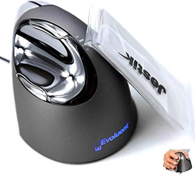 VALUE BUNDLE INCLUDES JESTIK MICROFIBER CLEANING CLOTH Avoids forearm twisting for comfort and good health The patented shape supports your hand in an upright neutral posture that generally avoids forearm twisting. Many users, including medical doctors, ergonomists and physical therapists, said the Evoluent VerticalMouse provides superior comfort and even relieved their wrist pain. Comfortable and easy to use The shape is thoughtfully sculpted for uncompromised comfort and easy-to-reach programmable buttons. No finger contortions are needed to operate the buttons. Improved thumb rest The thumb rest has been reshaped to provide even more comfort over earlier versions. Now two thumb buttons A new bottom thumb button provides greatly extended functionality when used with the included driver. Extended lip prevents rubbing An extra wide lip along the bottom edge prevents the last finger from rubbing the desk. Adjustable optional sensor Pointer speed controls on the side allow convenient adjustment without even releasing your grip from the mouse. Pointer speed indicators Top mounted LEDs show through the chrome thumb rest to indicate selected pointer speed including extra low (XL), low (LO), MD (medium), to high (HI). Lighted Evoluent logo The logo is pure eye candy. The illumination turns off when the system is in sleep mode to conserve notebook battery power.