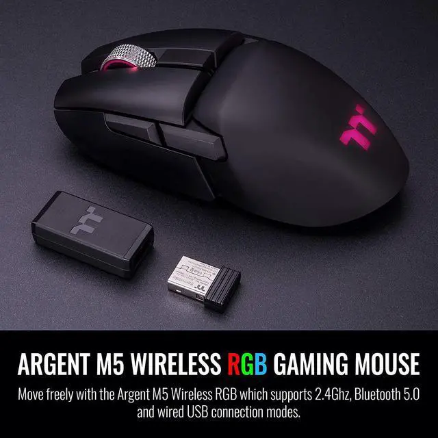 It comes with 16.8M true RGB color illumination across 2 zones, with 6 customizable dynamic lighting effects. Other features include the ARM based 32-bit MCU with on-board 64Kb flash memory, 8 programmable buttons and metal scroll wheel design. Use the iTAKE software to customize macros, game profiles and RGB lighting effects; SyncALL RGB colors via the TT SYNC function for Thermaltake Gaming peripherals.?P/N: GMO-TMF-HYOOBK-01 ?COLOR: Black ?SHAPE: Ambidextrous for right hand and left hand ?NO. OF BUTTONS: 8 ?NO. OF MACRO KEYS: 4 ?ON-BOARD MEMORY SIZE: 64Kb ?OMRON SWITCHES: 50 Million click lifecycle ?USB CABLE LENGTH: 1.8m ?GRAPHICAL UI: TT iTAKE Software ?GOLD-PLATED USB: YES ?DIMENSIONS: 128 X 64 X 37 mm (L x W x H) ?NET WEIGHT: 117 g (Mouse only) ?LED COLOR: 16.8 Million RGB Colors ?LIGHTING EFFECTS: Static, Pulse, RGB Spectrum, Wave, Reactive, Blink ?WIRELESS RANGE: 2.4G & Bluetooth : 10M ?BATTERY LIFE: 2.4Ghz : Up to 36 hours with lighting or 100 hours with lighting turned off. ?Bluetooth 5.0 :Up to 52 hours with lighting or 200 hours with lighting off. ?SENSOR NAME: PIXART PMW-3335 ?SENSOR TYPE: Optical ?DPI: 100 ~ 16000 ?DEFAULT DPI: 800, 1200, 1600, 3200, 6400, 16000 ?IPS: 400 ?ACCELERATION: 40g ?POLLING RATE: 1000Hz, 500Hz, 250Hz or 125Hz (1ms, 2ms, 4ms or 8ms)
