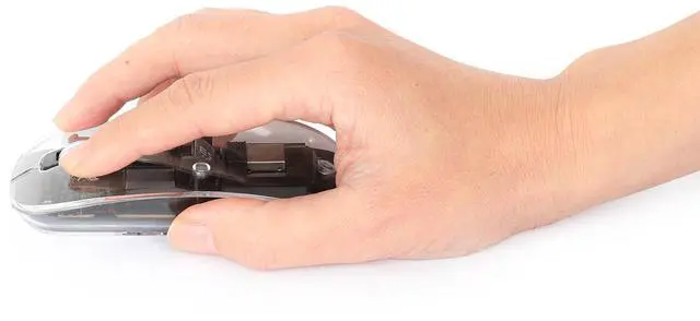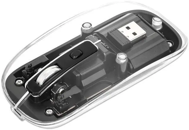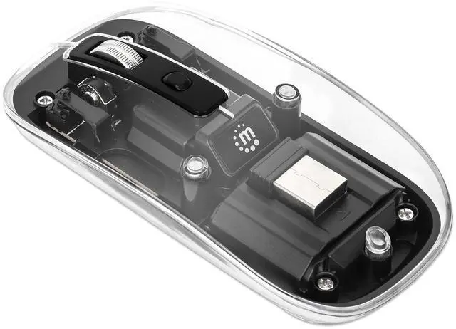 Wireless Mouse with A View - Plus RGB LED Light and Ambidextrous Design for Left-Handed Computer UsersThe Manhattan Transparent Wireless Optical USB Mouse is your attractive blend of style and functionality. Its transparent shell on a sleek silhouette showcases its components while the logo changes its colors in dynamic RGB light. The optical sensor immerses the mouse's entire edge in a stylish red. Wireless freedomThe 2.4 GHz RF micro receiver offers an effective range of up to 33 feet (10 meters). Ambidextrous design ensures comfort for both left- and right-handed users, while the top-mount, push-button control allows you to instantly shift resolution between 800, 1200, and 1600 dpi - perfect for your daily work or gaming needs.