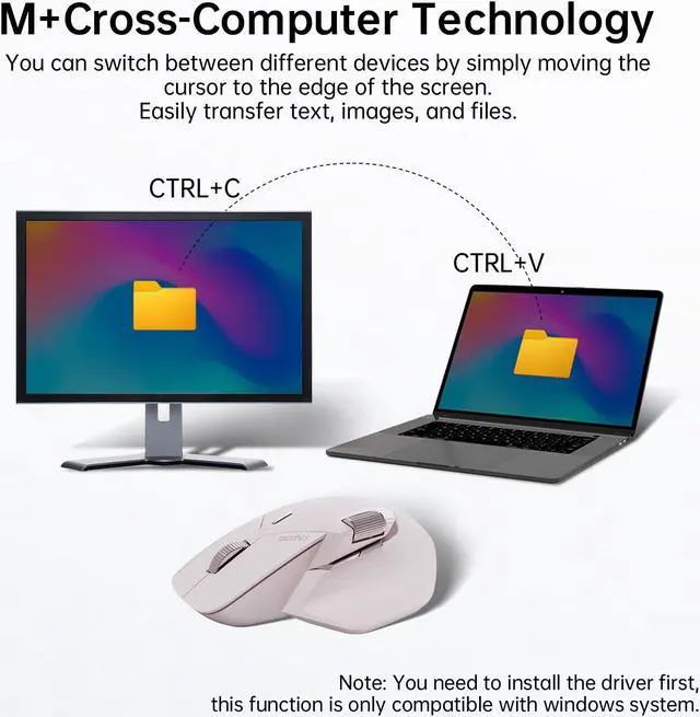 Select [Cross-Screen], pair the mouse to all your computers via 2.4GHz, connect your computer to the same Wi-Fi or Ethernet network, switch to LAN mode, then turn on Cross-Screen Function and Shearboard Function. Then you can enjoy the cursor flow and wireless file transfer between computers.