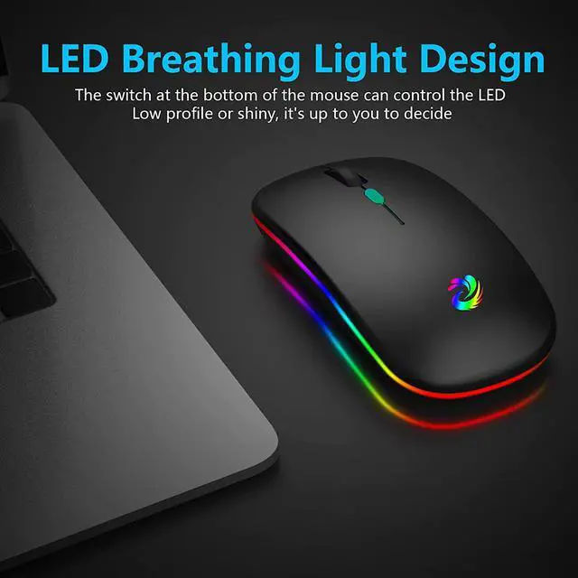 Upgraded Version LED DesignUpgraded version wireless mouse with the LED lights. The bottom of cordless mouse has a switch, support independent opening of basic mouse functions and decorative breathing light mode. When you turn on the LED light mode, it can be cyclically transformed into a variety of different colors add fun to boring work and life.