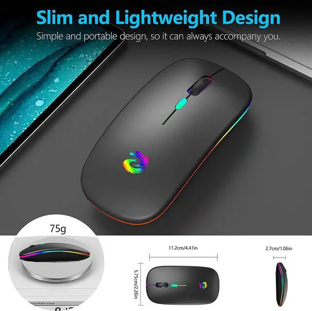 Silm and PortableRGB Optical Mouse about 4.41 x 2.26 x 1.06 inch, and the weight is about 75g, lightweight and slim. Portable wireless mouse perfect for travelling carry and it can be easily put into your laptop bag or pockets, ultra-space saving.