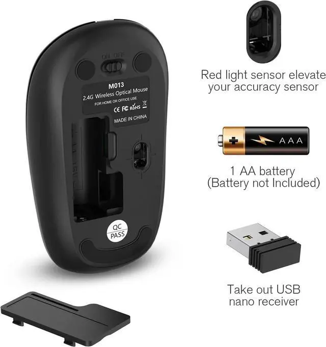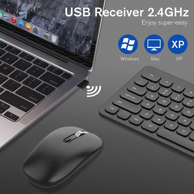 ?Faster & Stable Transmission. The wireless mouse adopts 2.4GHz wireless technology, which provides automatic frequency identification and stable signal without delay. Wireless transmission distance up to 33 feet. You can use this mouse anytime, anywhere. Just plug the USB receiver into your PC or laptop and the mouse work right away. ( NOTE: The USB receiver is stored in the mouse's battery compartment.)