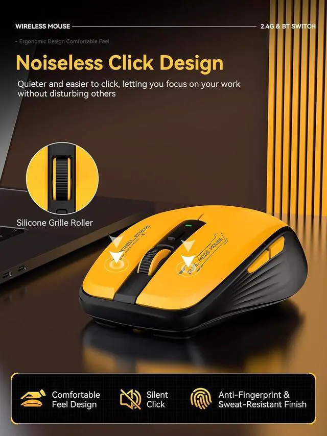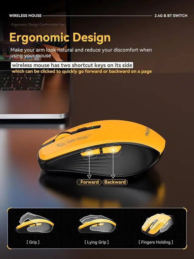A dual-mode mouse with 2.4GHz and Bluetooth connections, enabling one mouse to control two devices and featuring two shortcut keys for forward and backward on the side, helping you complete your study or work faster and better.
