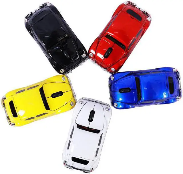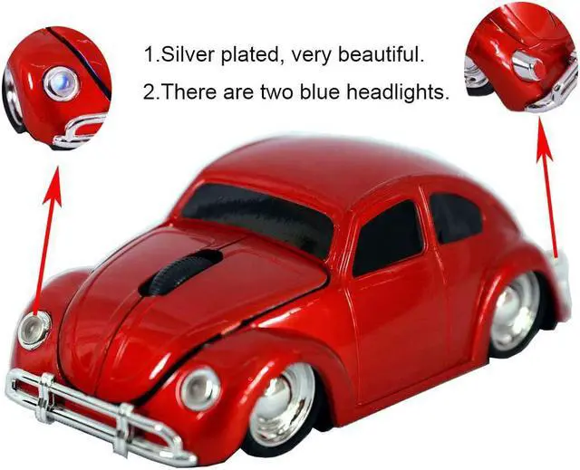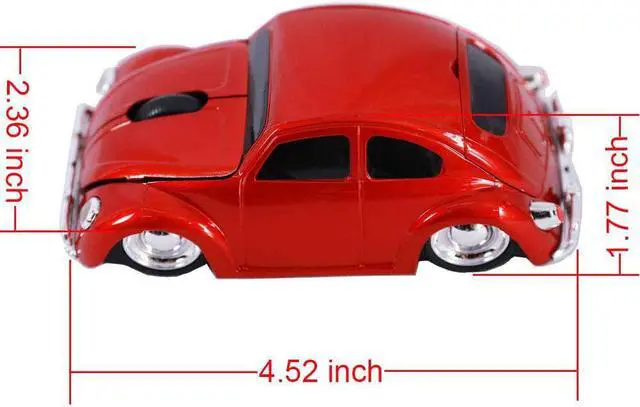 Cool sprot car shaped wireless mouse for laptop computer notebook, eyecatching ergonomic design, good choice as a gift for kids, teens, students, teachers, girls, wowen and men, VW beetle fans Mini Receiver can be inserted into the slot in the bottom of the mouse, allowing ease storage when not used. Uses 2.4G hz wireless optical technology, transmission up to 10 metres operating distance. Plug and play, no need any drive, works on most surfaces smoothly. Support most operating system, Windows 98 / ME / NT / 2000 / XP / Vista / Win 7 /win8/win10/ Linux or Mac OS. With cool design and comfortable hand feeling, this wireless mouse give you special experience in using it. Powered by 2 * AAA battery (Not Included), Dimension: 4.52 (L) * 1.77 (H) * 2.36 (W) inch, Net Weight: 2.47 oz, 1600 DPI, 3 Buttons. Switch Life: 5 million cycles, Automatically Power saving sleeping function.