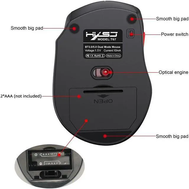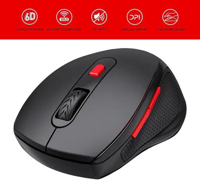 (1) Support BT3.0/BT5.0 connection, 10m wireless transmission distance, you can enjoy the fast data transmission at the convenience of the wireless technology. (2) 3 adjustable DPI (1000-1200-1600DPI), easy to switch, accurate positioning, smooth operation. (3) Ergonomic design, the mouse fits the palm, comfortable grip, not easy to fatigue. (4) Simple appearance and lightweight, easy to carry and use. (5) Silent design, no need to worry about disturbing others. (6) Widely compatible with Windows XP/Vista/Win7/Win8/Win10, mac OS (mac OS 10.10 above is recommended), etc.