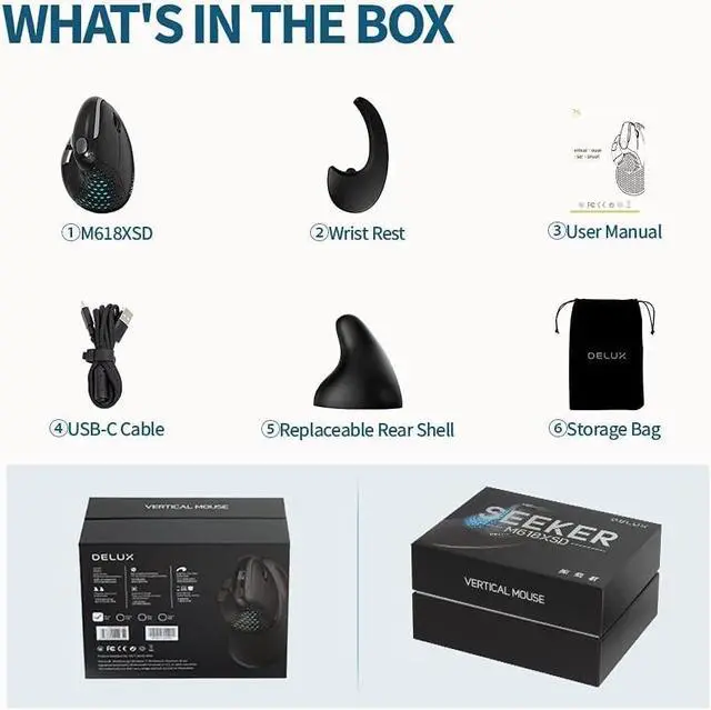 [Follow Nature, Get Comforts] with DELUX decades design experiences in vertical mouse and based on human-friendly concept, DELUX SEEKER was designed with ergo snail bionic structure for nature handshake position, magnetic detachable wrist rest for extended comforts and with up to 7200DPI tracking engine for less movement to reduce fatigue