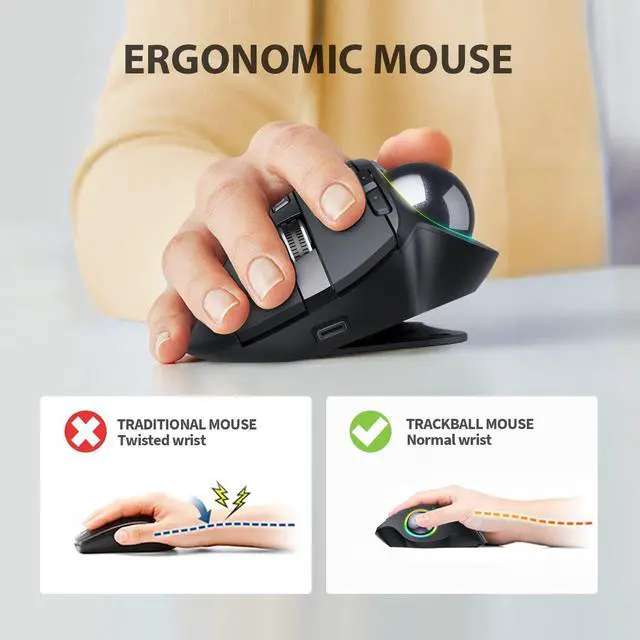 The ergonomic thumb-operated trackball mouse breaks with the traditional design. Adding dynamic lighting around the trackball provides a relaxed colorful working atmosphere. It will effectively reduce the wrist pain or arm strain in the daily long computer work with 0 to 20 adjustable angle. Connect it via Bluetooth or 2.4G USB receiver. The trackball flows freely between Windows, macOS, Android, tablet. It provides you with the most excellent tracking experience