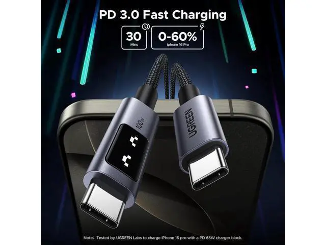 UGREEN Uno USB C to USB C Cable 100W Fast Charging Cable Type C Charging Cord with LED Display for iPhone 16/16 Plus/16 Pro/16 Pro Max/15, MacBook Pro/Air, iPad Pro/Air, Galaxy S24 Ultra 6.6FT Black