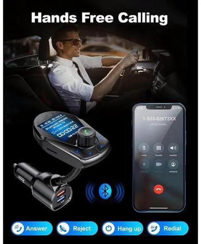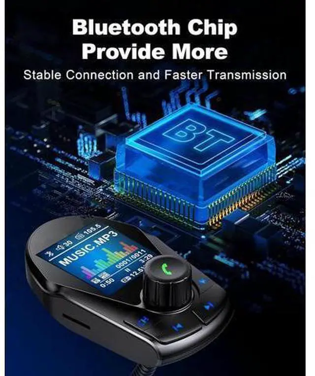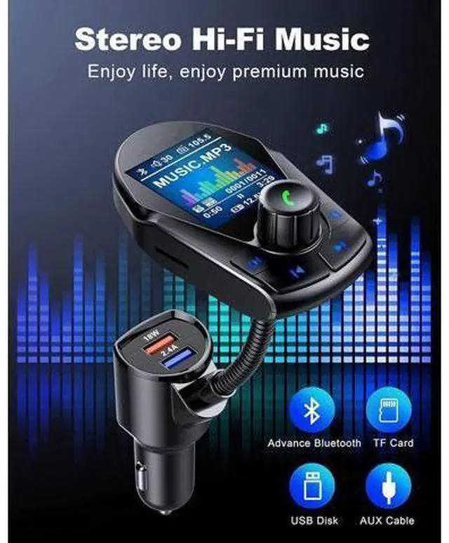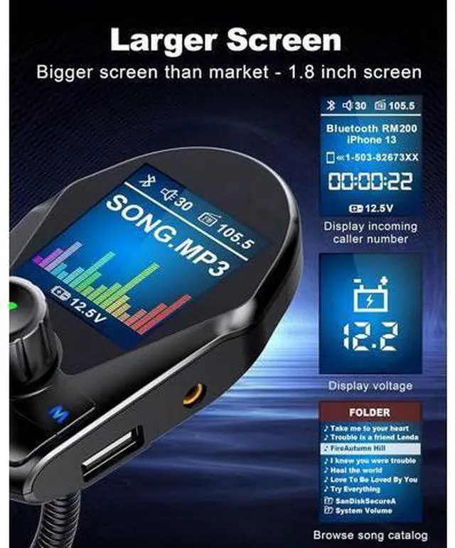 Product Dimensions 3.15 x 1.97 x 5.12 inches Item Weight 6 ounces Features Large 1.8 -inch color screen, auxiliary input/output, built-in microphone, hands-free calling, Bluetooth FM transmitter, noise cancellation, fast charging Large 1.8 -inch color screen, auxiliary input/output, built-in microphone, hands-free calling, Bluetooth FM transmitter, noise cancellation, fast charging Connectivity Bluetooth, Auxiliary, USB Power Supply Wired Electricity Material Plastic