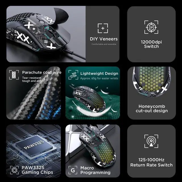 DPI: 800/1600/2400/3200/6400/12000. High-precision Pixart PAW3325 optical sensor, ensure transmission stability and accuracy of analysis, enhanced game performance, compatible with 4K computer monitor.