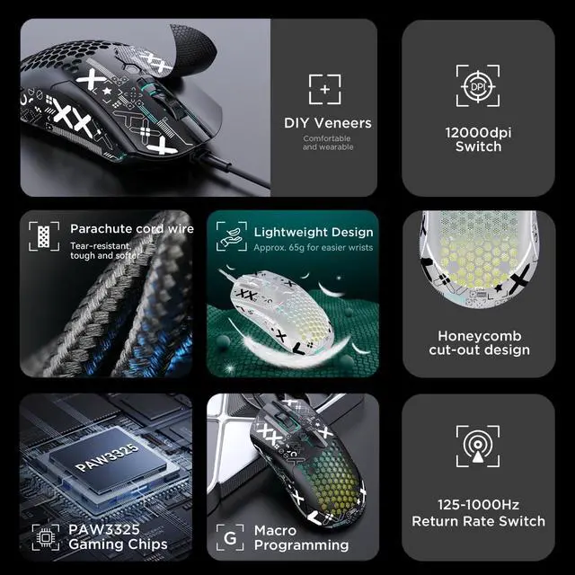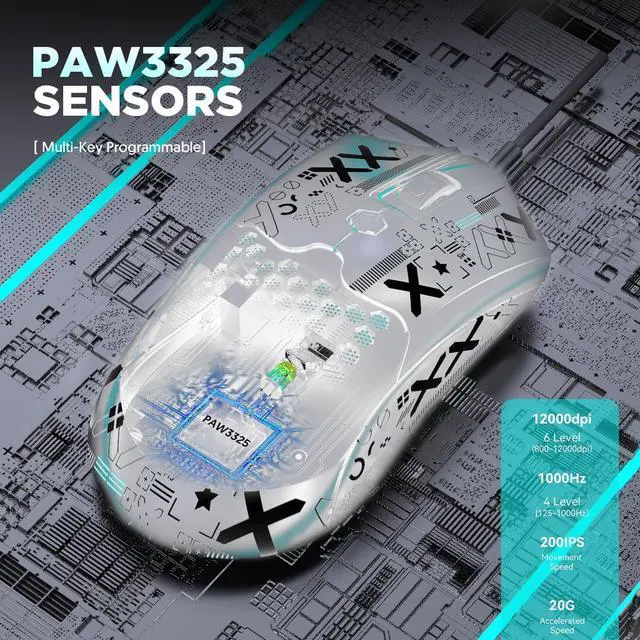 DPI: 800/1600/2400/3200/6400/12000. High-precision Pixart PAW3325 optical sensor, ensure transmission stability and accuracy of analysis, enhanced game performance, compatible with 4K computer monitor.