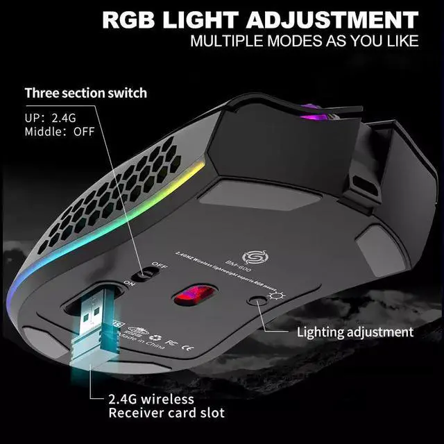 RGB Backlit Gaming MouseThis wireless rechargeable mouse can provide 5 kinds of chroma backlight to meet your different style of game needs. You can change the backlight mode through the light adjustment button at the bottom. And also you can turn the power off by adjusting the bottom to the position of Off and ON.