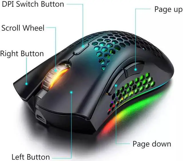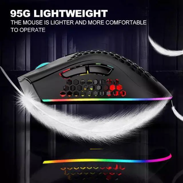 Light Honeycomb Wireless Gaming MouseThe well-designed ergonomic hollow perforated shell, brings you the most extreme gaming experience. Reduces weight, improves heat dissipation, they provide ventilation to keep your palms cool and fresh. Assures your long-session gaming without fatigue.