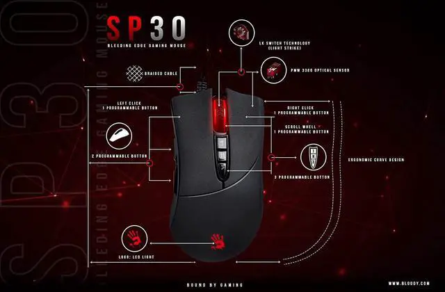 Bloody SP30 Ergonomic Optical Switch Gaming Mouse - Fastest Mouse Switch in Gaming - Enthusiast Grade Sensor - 8 Programmable Buttons - Non-Slip Rubberized Black