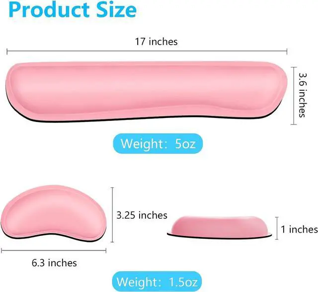 Enlarge Thicken Size 17* 3.6 *1 inch keyboard wrist rest pad and 6.3 * 3.25 *1 inch mouse wrist pad offer more support to your wrist. Four color to choose from, includes pink, black, grey, green and this wrist rest is also light as a feather at only 5 ounces, allowing you to easily bring it with you if needed.