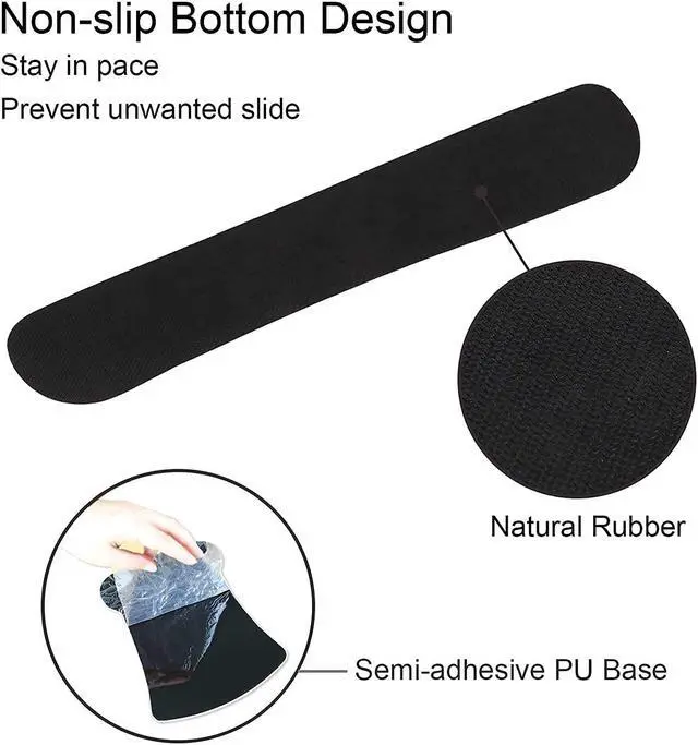 Non-slip BaseThe bottom of the keyboard wrist adopts anti-skid rubber material. The bottom of the Mouse Wrist is with Semi-adhesive PU. They can be firmly fixed on the desktop to prevent sliding, also no fear of residue or trouble adjusting.