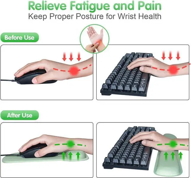 Ergonomic DesignThe curved design of these two wrist rests fits perfectly on the wrist. Keep wrists at the proper posture for wrist health, effectively relieve wrist fatigue and pain