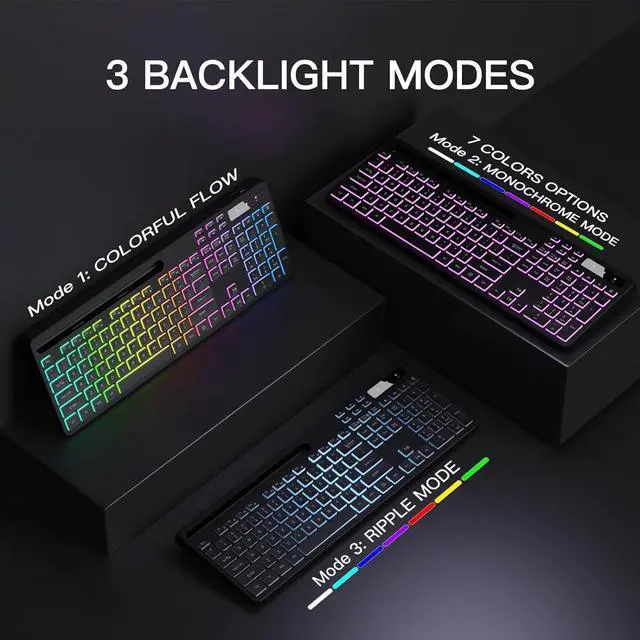 Wireless keyboard has 7 colors & 3 modes backlit options and adjustable brightness to provide you with more visual aesthetics typing atmosphere.