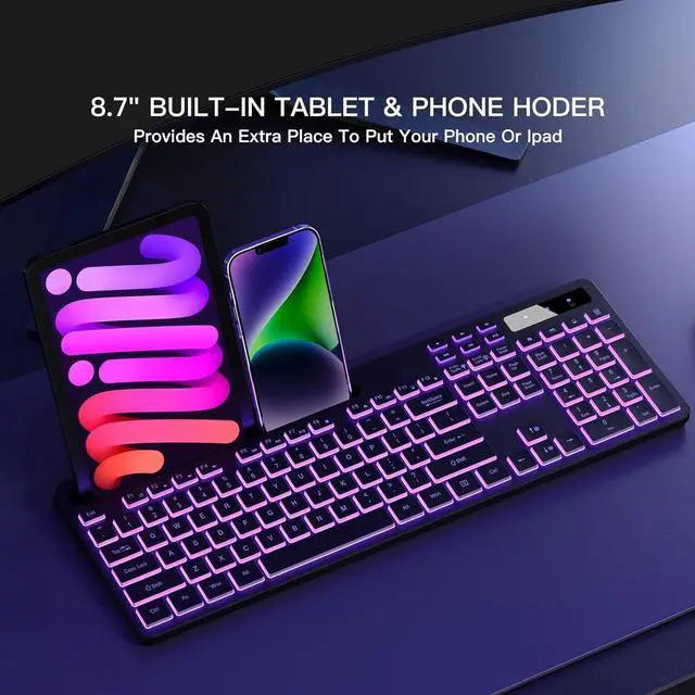 Computer keyboard designed with 8.7 " convenient device holder to hold your phone or tablet, keep your desk clean and tidy.