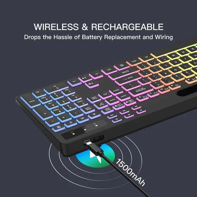 Backlit wireless keyboard with built-in 1500mAh rechargeable battery that reduce the hassle of traditional battery replacement and wiring.