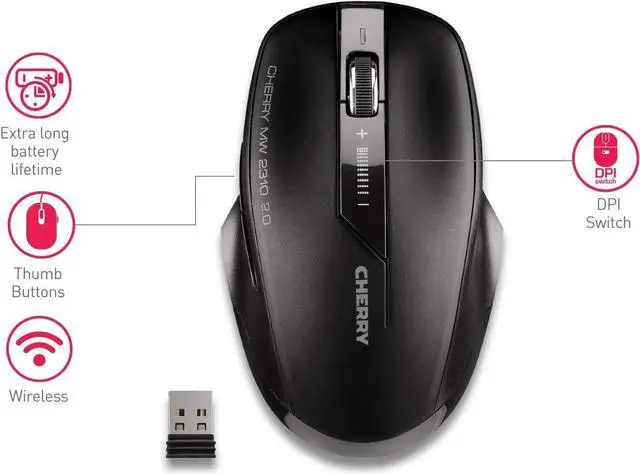 The cordless PC mouse fits perfectly in the hand and a LED indicates the set resolution (1000/1600/2400 DPI)