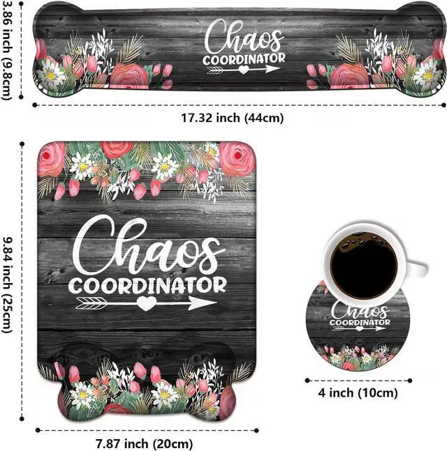 Optimal accessories 3-in-1 Set Include a keyboard wrist rest ( 17.32 x 3.86 inch), a mouse pad with wrist support ( 9.84 x 7.87 inch) and a cute cup coaster (4 x 4 inch). All of the three items can make your office or home more colorful and give you a better environment to use the computer at home or work.