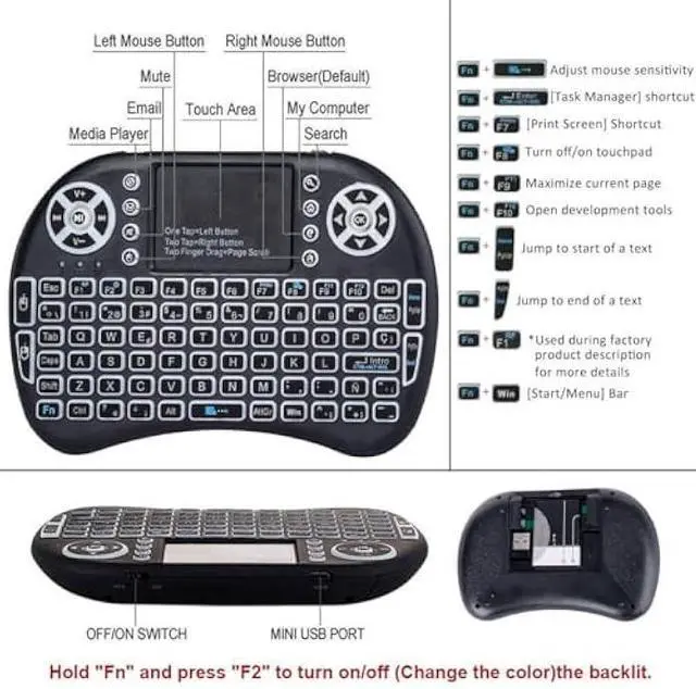 About Changing 7 Colors BlacklightHold FN and F2 To turn on the backlit on this mini keyboard, Long press the Fn button, then move up and down on the touchpad with two fingers to switch colors you want. (Note: the backlights are evenly distributed on the wireless keyboard, makes it is easy to see at night or in a theater room, ect).