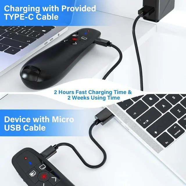 Maximum output: <5 mW.? LONG CONTROL & BRIGHT RED LIGHT: Wireless remote control of 100ft and long range red light control of 656ft. The clicker for PowerPoint presentations to highlight and point out the key part to catch audience's eyes with its bright red light which is easy to be seen clearly against most background(Not recommended for TV/LED/LCD screens). Use this clicker allow you can stroll around the room to have closer communication with audience.? 2-IN-1 USB TYPE C & REACHARGEBLE PRESENTATION CLICKER: 2-in-1 USB Type C receiver plug-and-play. No software is required to install. For mac users a simple set-up is required before use. Clicker for PPT with RF 2.4 ghz USB receives slide clicker compact and portable don't worry about not carrying batteries. Clicker built-in 300mAh battery it supports one week using after charging for 2 hours. USB receiver embedded in the bottom of the remote clicker for presentations to avoid losing.?