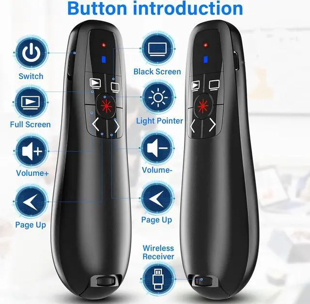 ? INTUITIVE PRESENTATION POINTER WITH VOLUME CONTROL: This wireless clicker supports HYPERLINK switch windows full/black screen volume control page up page down. Not only does this power point remote clicker help gain more confidence in your teaching coaching speeching meeting or conference presentations but also this presentation remote also works as a cat chase toy using the bright red light to have fun with your pets.