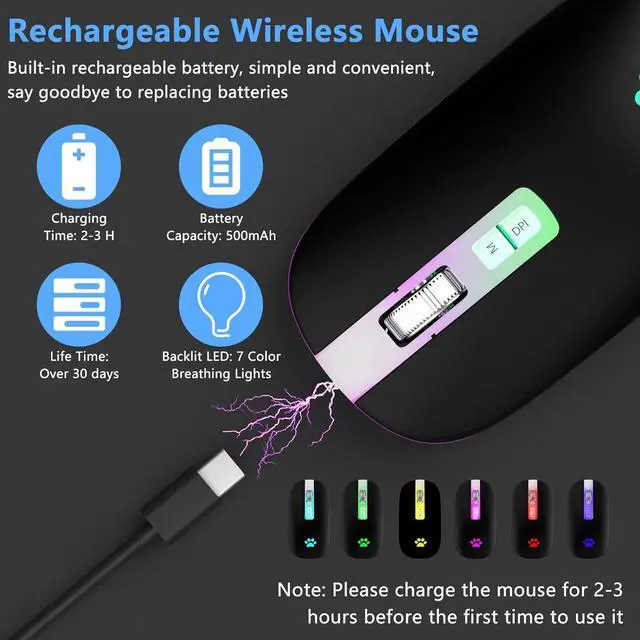 Rechargeable Optical Mouse Cordless mouse with built-in rechargeable lithium battery, high cycle life. The mini mouse has no need to change the battery, it can be easily charged using the included USB cable, just 2-3 hours charging. You can use more than 7 days of working time and 30 days of standby time. Please charge the mouse for 2-3 hours before the first time to use it