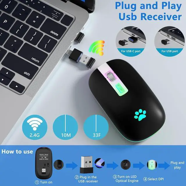 Wide Compatibility 2.4H z wireless mode works with computer, laptop, desktop with USB, type-c port, plug and play. The USB receiver is stored inside the back of the mouse.