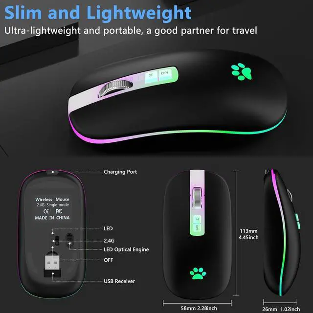 Silent & Comfortable MouseSilent click wireless mouse with a classic ergonomic design offers your hand maximum support and comfort. The silent button reduces 90% noise, helps you concentrate on your work/study without disturbing others besides you, which makes it an ideal wireless mouse for office, conference room, cafe, library, or bedroom. Ultra-thin, lightweight and convenient for carrying or traveling