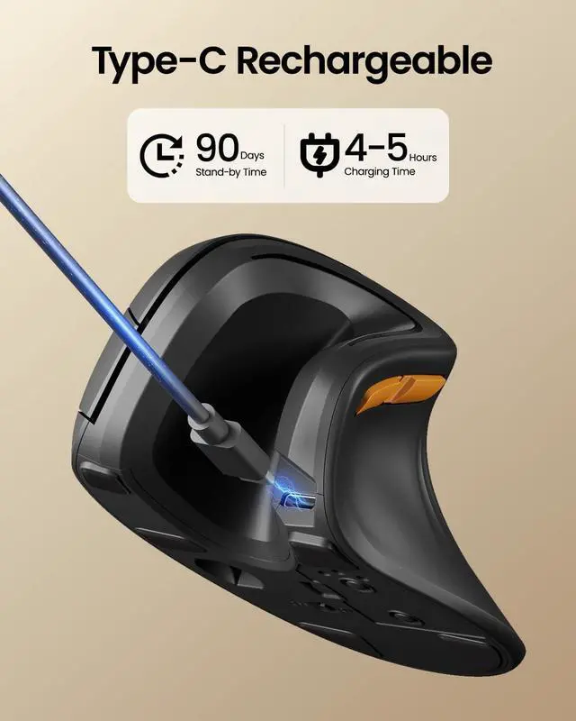 Rechargeable Ergonomic Mouse: The Bluetooth Vertical Mouse has a built-in 500mAh Li-Ion battery that can be conveniently recharged using the included Type-C cable.