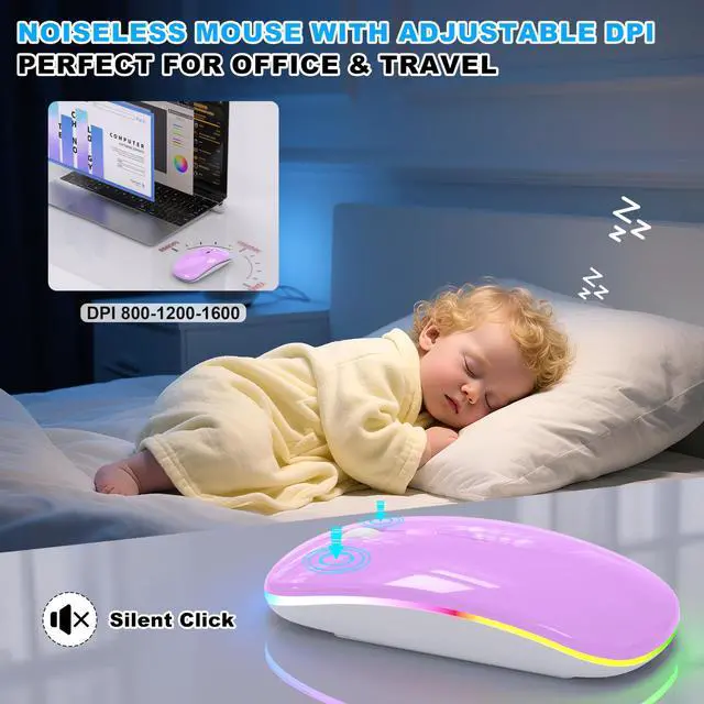 Azmall LED Wireless Mouse features a dual-mode connectionBluetooth 5.2 and 2.4GHz wireless via both USB-A and USB-C receivers, ensuring wide compatibility with almost any device including MacBook Air/Pro, laptops, PCs, iPads, tablets, Android devices, and more. This light-up mouse offers 7 vibrant LED color modes to match your mood or workspace. The silent click design allows you to stay focused without disturbing othersperfect for offices, libraries, or late-night use. With 3-level adjustable DPI (800/1200/1600), you get precise cursor control for all tasks. Plus, the built-in mouse jiggler mode keeps your screen awake during video calls, presentations, or downloadseven when you're away.