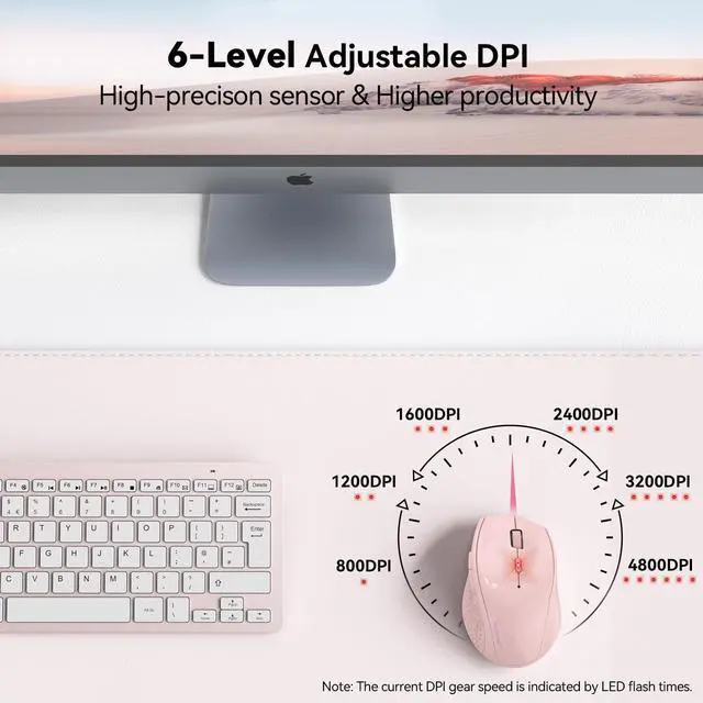 TECKNET wireless mouse has a 6-Level adjustable DPI (800/1200/1600/2000/2400/3200) with DPI gear indicator, which indicates the current DPI gear speed by LED flash times (1/2/3/4/5/6 times).
