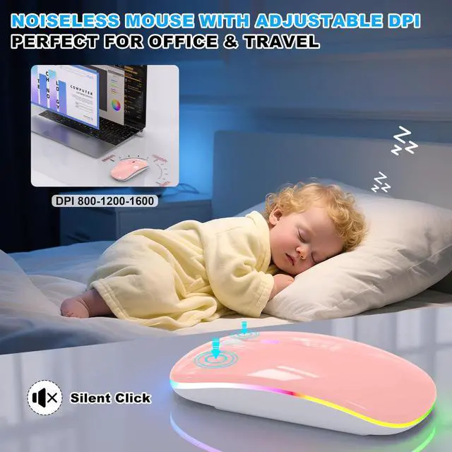 Azmall LED Wireless Mouse features a dual-mode connectionBluetooth 5.2 and 2.4GHz wireless via both USB-A and USB-C receivers, ensuring wide compatibility with almost any device including MacBook Air/Pro, laptops, PCs, iPads, tablets, Android devices, and more. This light-up mouse offers 7 vibrant LED color modes to match your mood or workspace. The silent click design allows you to stay focused without disturbing othersperfect for offices, libraries, or late-night use. With 3-level adjustable DPI (800/1200/1600), you get precise cursor control for all tasks. Plus, the built-in mouse jiggler mode keeps your screen awake during video calls, presentations, or downloadseven when you're away.