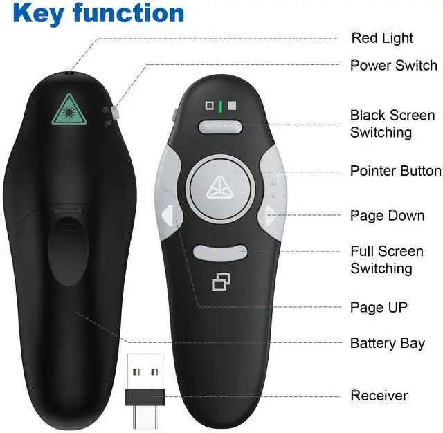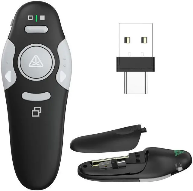 Upgrade your presentations with this presentation clicker! Stand out during your next meeting, lecture, or conference with its sleek design, a useful tool for smooth PowerPoint presentations. Designed for professionals, educators, and students, this PowerPoint clicker combines precision control, portability, and plug-and-play simplicity to help you capture your audience's attention. Key Features: Wireless Freedom: Control your slides from up to 328 feet away with stable 2.4GHz USB connectivity, designed to minimize delays or dropouts. Ergonomic Design: Highlight key content with a bright red light and enjoy a comfortable grip for extended use. Universal Compatibility: Works with PowerPoint, Google Slides, Keynote, and more .It's compatible with(Windows/macOS/Linux supported). Extended Battery Life: A single AAA battery provides power for extensive use, reducing the need for frequent replacements. The clicker includes dedicated page up/down buttons, a built-in silencer for the light, and a compact USB receiver that stores neatly inside the device. It slips into any pocket or bag, making it a great choice for on-the-go presenters. Package Includes: 1 Presentation Remote, 1 USB Receiver, 1 User Manual. Suitable For: Business pitches, classroom teaching, webinar hosting, and conference keynotes.