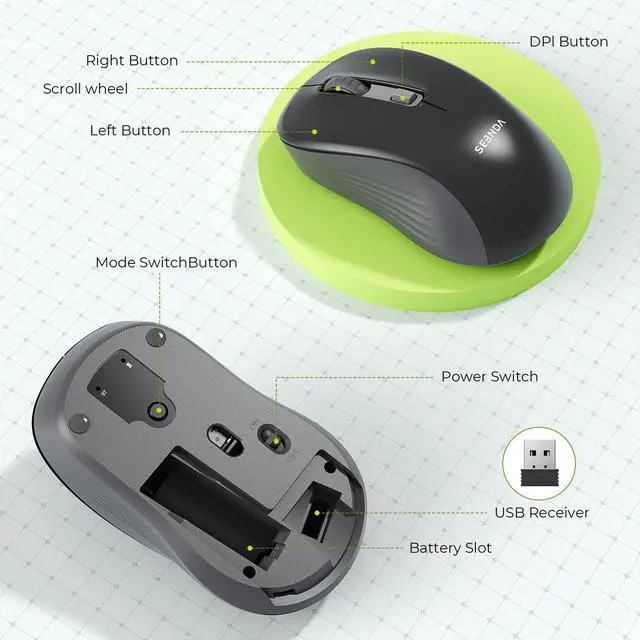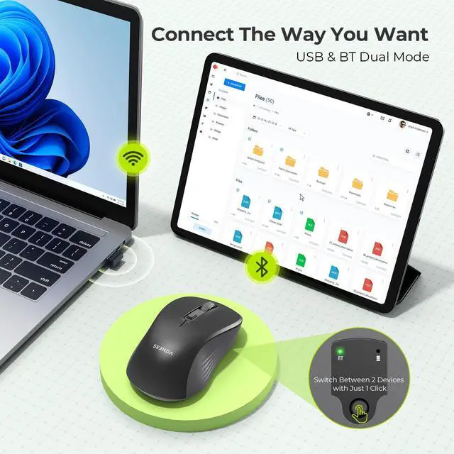 This mouse offers Bluetooth (without the receiver) and USB-A (with the receiver) connection, can connect up to 2 devices, switch button located beneath the mouse enables convenient and effortless switching.
