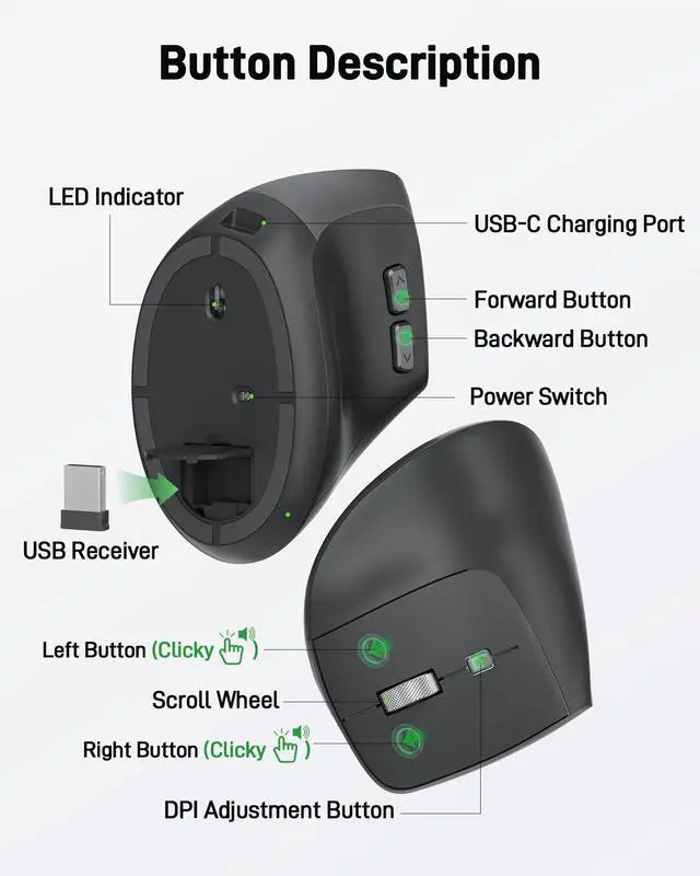 | - | 1. Switching from a traditional to an ergonomic mouse may require 1-2 weeks of adjustment. 2. Please adjust your grip to allow your palm to naturally fit the curve of the mouse to reduce hand fatigue. |