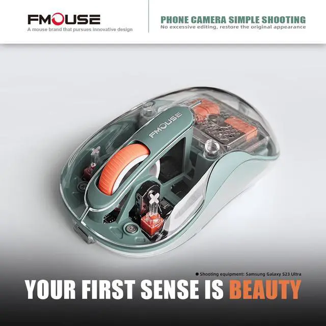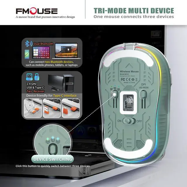A unique wireless transparent mouse created by the FMOUSE brand, with Tri-mode dual Bluetooth configurations of 2.4G and BT1/BT2, capable of connecting multiple devices for use. It is also equipped with two receivers, USB and Type-C, which are friendly to devices with Type-C interfaces.