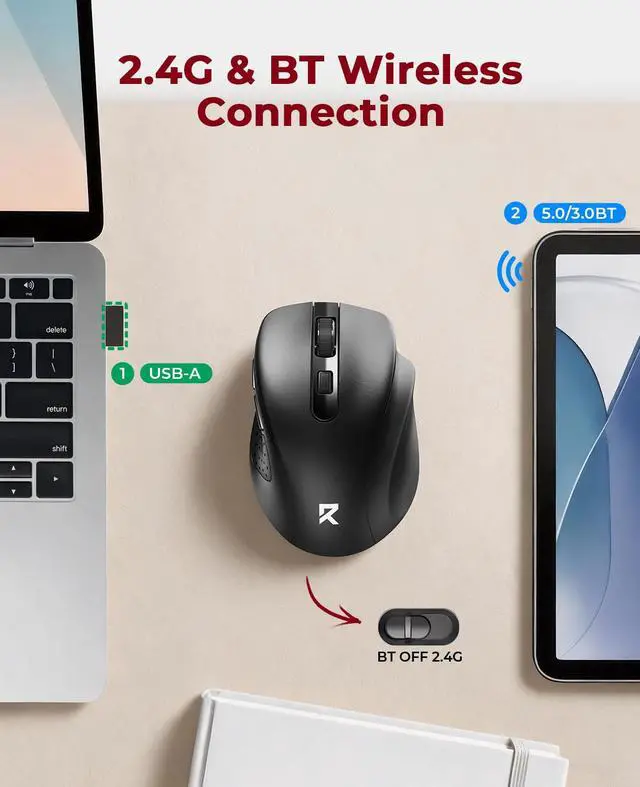 • Dual Device ConnectionConnect 2 devices via Bluetooth (3.0/5.0) or USB A. Easily switch between them with a slide of the switch button.(Note: This mouse is ideal for small to medium hands, but larger hands may still enjoy its compact design)